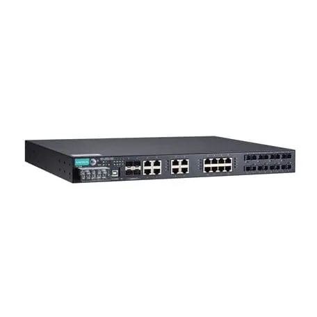 IEC 61850-3 managed rackmount Ethernet switch with 8 100BaseFX ports(MST), 16 10/100BaseT(X) ports, and 4 1000BaseSFP ports; for a total of up to 28 ports, 1 isolated power supply (18 ~ 72VDC), -40 to 85°C operating temperature